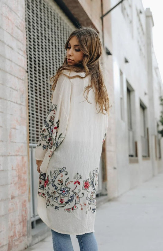 Embroidered Kimono, Spring Summer Autumn Floral Embroidered Kimonos in Ivory Beige