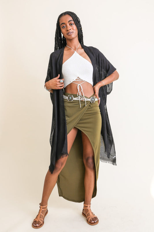 Black Beach Cover Up Lightweight Kimono Duster with Floral Leaf Print