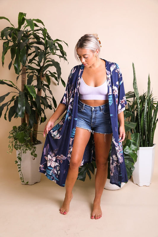 Flowy Spring Summer Kimono Duster with Floral Leaf Print